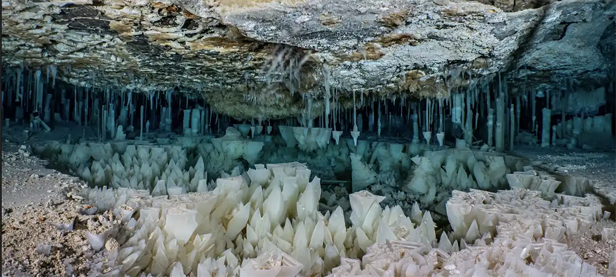Lead image: delicate crystal formations stretch like glass chandeliers inside the Glass Factory chamber of Ralph’s Cave, Abaco Island